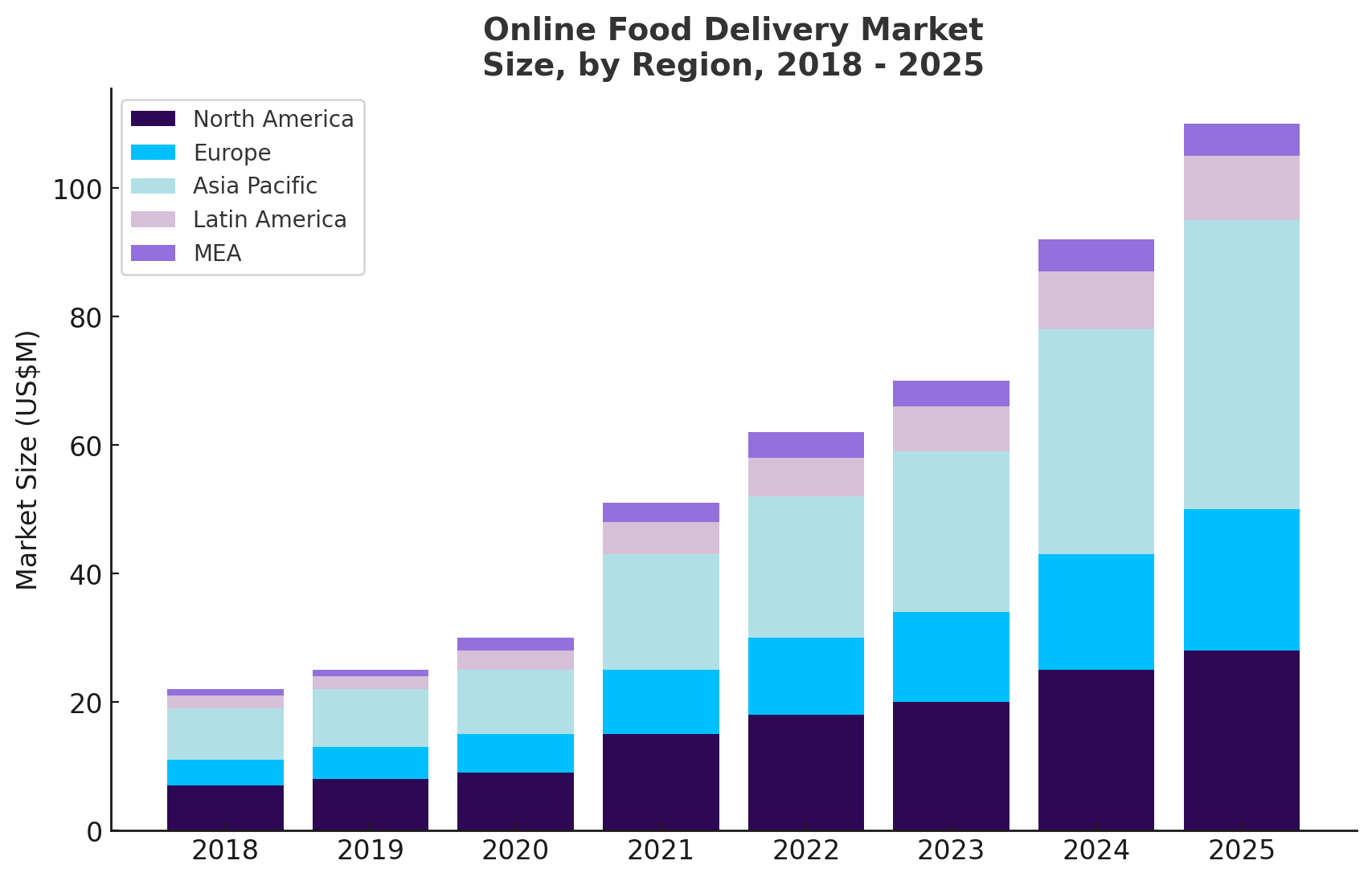 Global online food delivery market size by region (2018–2025), showing strong growth driven primarily by Asia Pacific and North America.