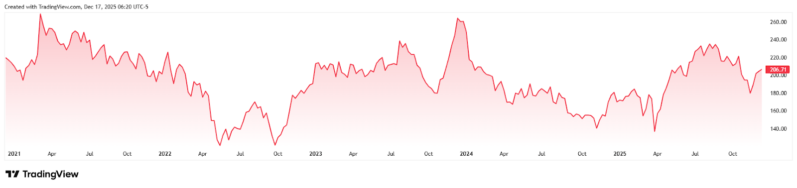 Last five years ' stock price of Peloton Interactive Inc. (PTON)