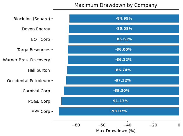 Top 10 S&P 500 Stocks by Highest Max Drawdown (2016–2026)
