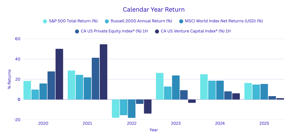 Venture/Growth equity. | AI adoption, M&A. | Secondaries up 51% H1 2025; hold periods >6 yrs. | |