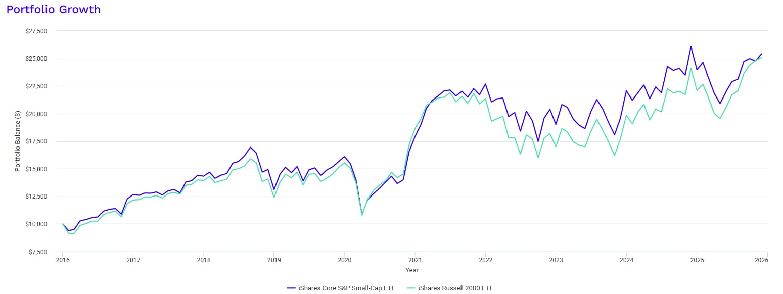 A $10000 investment would have grown at 9.86% CAGR in the S&P 600 vs 9.71% CAGR in the Russell 2000